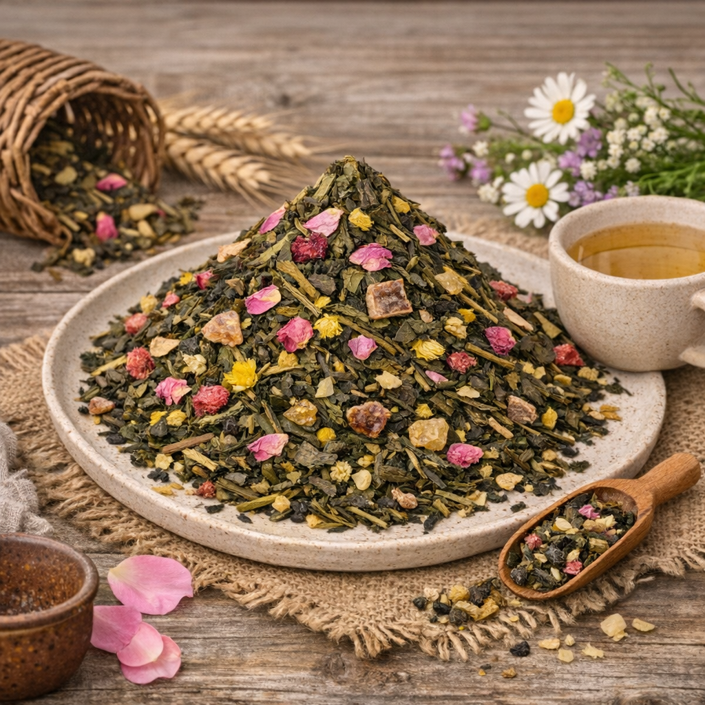 Thé vert China Sencha* (77%), datte (datte, farine de riz)* (22%), arôme naturel de framboise, arôme naturel de cassis, fleurs d’immortelle*, pétales de rose*, arôme naturel de fraise, arôme naturel de rose. *Issu de l‘agriculture